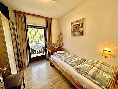 Room with 1 single bed, a sink, and balcony with views of the Salzach River. The shared-use bathroom and toilet are located on the hall.