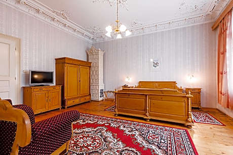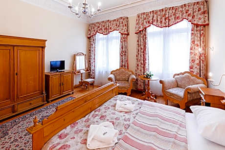Hotel Hotel Heluan, nestled in Karlovy Vary’s spa district, offers contactless check-in for convenience. Located directly opposite the Castle Colonnade and just steps from the Spring and Market colonnades, our hotel is also a brief drive from Goethe's Lookout Tower and a leisurely 12-minute stroll from the Mill Colonnade. Enjoy easy access to the town theater and a nearby cable car to Diana Lookout Observation Tower. Our accommodations feature spacious rooms with stucco ceilings, majestic doors, and windows, some offering town views. Each room is equipped with coffee and tea facilities, a mini-fridge, a writing desk, a smart TV, and reliable WIFI. Bathrooms are stocked with towels, hairdryer, shower gel, and shampoo. Start your day with our continental hot and cold buffet breakfast. Despite its quaint size, the hotel features a charming, fully functional old-style elevator. Advance reservations are required for our limited on-site private parking. Enjoy the convenience of self check-in, allowing you to arrive and check in at your leisure, hassle-free.