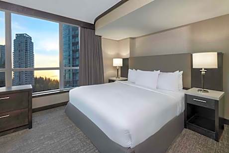 Featuring an outdoor pool and on-site restaurant, Hilton Vancouver Metrotown is located in Burnaby and offers meeting space. All contemporary guest rooms and suites offers floor-to-ceiling windows with views. A flat-screen cable TV, USB ports, and a work desk are provided. The private bathroom includes marble bath countertops, soaker bathtub, hair dryer, and free toiletries. Time and Place offers breakfast, lunch, happy hour and dinner. A fitness center offers guests an elliptical machine, rowing machine, and treadmills. Deer Lake Park is 9 minutes' drive away. Vancouver city center is 7.5 mi from the property.