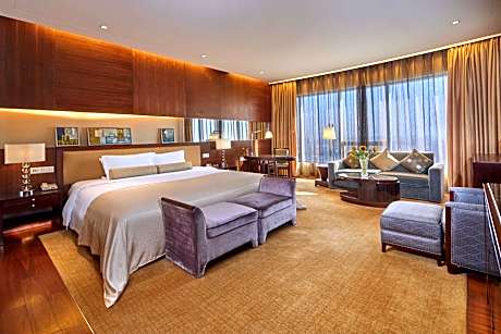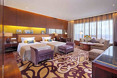 Located on 13th to 35th floor, this twin room has an electric kettle, a mini-bar, air conditioning, French furniture, floor-to-ceiling windows, electric curtains and free WiFi. The bathroom offers rain shower, bathtub and embedded LCD TV. This room rate includes breakfast for 2 people.