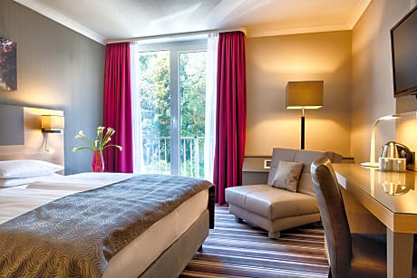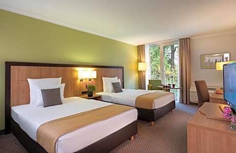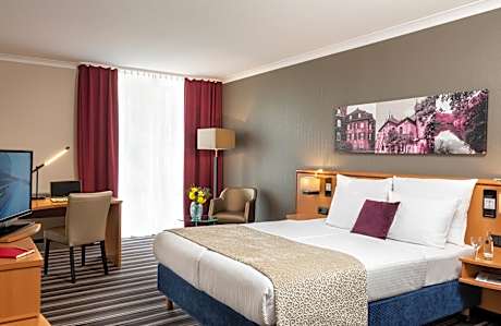 This hotel is located in the town of Ratingen, 7.5 mi north-east of Düsseldorf, with an indoor and outdoor pool and excellent motorway connections. The 4-star Leonardo Hotel Düsseldorf Airport Ratingen offers rooms which are spacious and comfortable with all modern amenities including WiFi. Relax in and around the indoor and outdoor pool area, or unwind in the Finnish sauna. Dine in the Mediterranean-style Da Vinci restaurant. After dinner, visit the rustic pub and unwind with a quiet drink. Upon request and subject to availability, the Leonardo Hotel Düsseldorf Airport Ratingen offers a shuttle service between the hotel and the airport for overnight guests. Guests enjoy excellent access to the A3/A52/A44 motorways, as well as Düsseldorf’s airport (2.5 mi), intercity railway station (1.2 mi), and trade fair and congress center (5.6 mi).