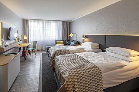 Just 3.7 mi away from Düsseldorf city center, this 4-star superior eco-friendly hotel in Neuss offers bright, modern and spacious rooms and suites as well as a sauna area with relaxation room. During warmer months, meals can be enjoyed on the delightful garden terrace. All of the rooms at the Holiday Inn Düsseldorf-Neuss feature a corner sofa, a flat-screen TV, air conditioning, hot drink-making facilities, a safe and ironing option. Free WiFi is available to guests throughout. A buffet breakfast is provided each morning. Diners can enjoy tasty local and international dishes in the Holiday Inn's Amoroso restaurant. After a busy day, the sports bar at the Holiday Inn Neuss is an ideal place to watch live sports with a refreshing drink. The A57 motorway is 2.5 mi away. The hotel is also near the Rheinpark landscape park and the River Rhine.