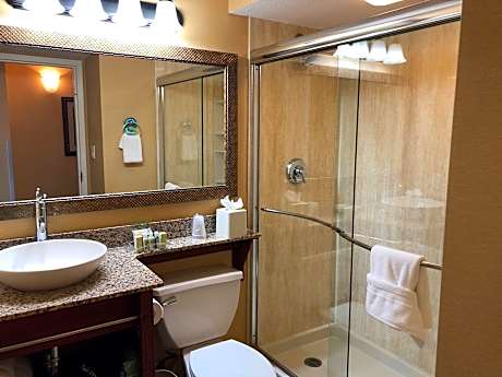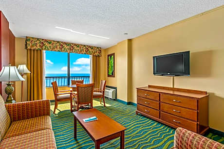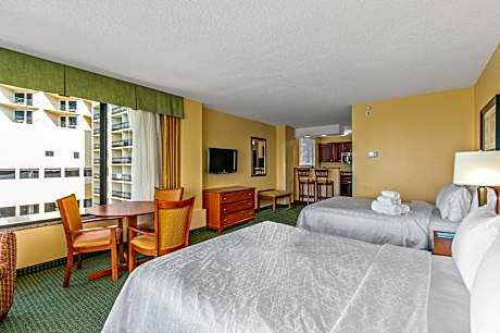 Each room features modern comforts, including a flat-screen TV, free WiFi, and a coffee machine. The en suite bathrooms boast granite countertops, hairdryers, and complimentary toiletries. Suites provide additional space with a sofa bed, living room, and a wet bar area equipped with a microwave and refrigerator. Some rooms also offer private balconies, perfect for enjoying scenic views.
