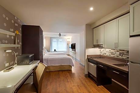 Accommodations at Homewood Suites Midtown Manhattan Times Square South include modern amenities such as flat-screen HD cable TVs, private bathrooms with hairdryers, and complimentary toiletries. The hotel’s 24-hour front desk ensures guest needs are met around the clock, while services like luggage storage, dry cleaning, and meeting facilities enhance the overall stay.