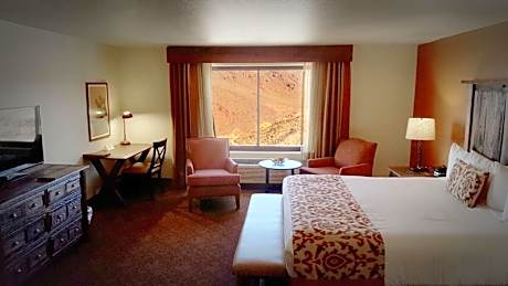 Each room, adorned with tasteful red accents, ensures a comfortable stay with amenities including a flat-screen cable TV, complimentary WiFi, and essential toiletries. A wooden desk and chair in every room cater to both leisure and business travelers. The Hoover Dam Lodge distinguishes itself with a blend of comfort and convenience, ensuring a memorable stay amidst the beauty of Boulder City.