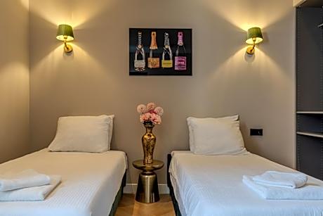 This twin room features a shared bathroom and heating. The air-conditioned twin room provides a flat-screen TV, a private entrance, a wardrobe, parquet floors as well as garden views. The unit offers 2 beds.