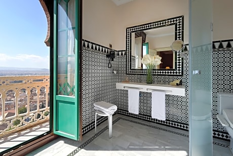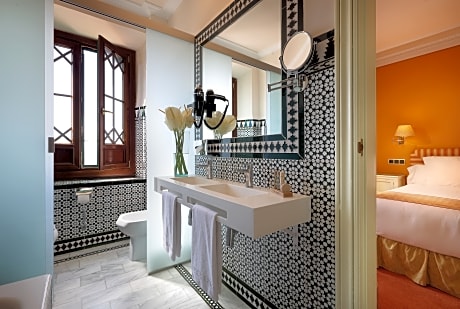The Hotel Alhambra Palace is located within the Alhambra grounds, only 328 feet from the main entrance to the monument, a 5 minutes walking. The hotel offers spectacular views over the city of Granada. It features stylish rooms with Moorish-inspired décor, free Wi-Fi and satellite TV. The hotel’s à la carte restaurant serves Mediterranean and International food. There is also a bar with a terrace boasting impressive views of Granada and Sierra Nevada. The Hotel Alhambra Palace’s front desk is open 24 hours a day, allowing you greater flexibility during your stay. There is a currency exchange service. The hotel offers parking with valet service for an extra charge. A bus stop directly opposite the hotel will take guests to the Alhambra or city center. It is a 10-minute bus ride to the UNESCO World Heritage site of Albayzín, the medieval Moorish quarter.