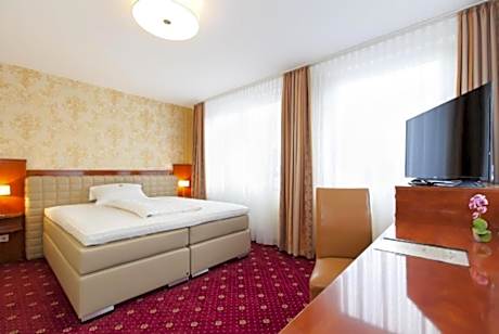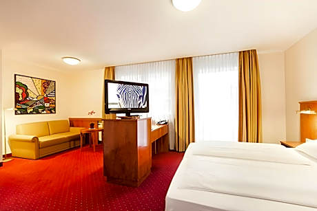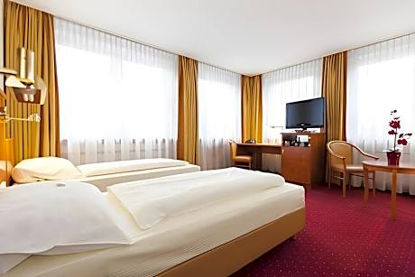 This modern hotel on Langenfeld’s central Hauptstraße is just 15.5 miles from the Düsseldorf and Cologne trade shows and enjoys easy access to public transportation services throughout the Rheinland region. The Hotel am Berliner Platz provides generously equipped, quiet rooms with free wireless internet access. The hotel’s tasty breakfast will give you all the energy you need. The Langenfeld S-Bahn (light rail) station is 550 yards from your doorstep. It has services to central Cologne and Düsseldorf; the trip takes 20 minutes. Highways A542 and A57 are also just a few minutes away.