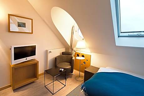 Top-floor room with sloped ceiling. The living area and bathroom feature porthole windows.
