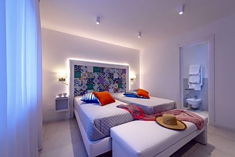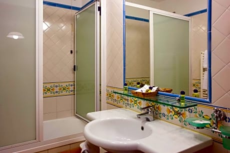 Air-conditioned room with satellite TV and a private bathroom with decorative Vietri tiles and a hairdryer.