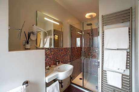 The bathroom is equipped with Pozzi-Ginori fittings, and features shower, hairdryer, and BeOne toiletries by MarieDanielle.
