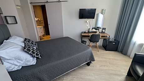 Room with air conditioning, satellite TV, telephone, work desk and private bathroom.