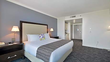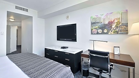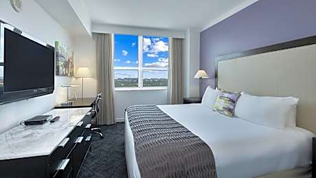 - Modern guest rooms featuring wall-mounted 42-inch flat-screen TVs, coffee makers, and safes, with panoramic bay or city views.