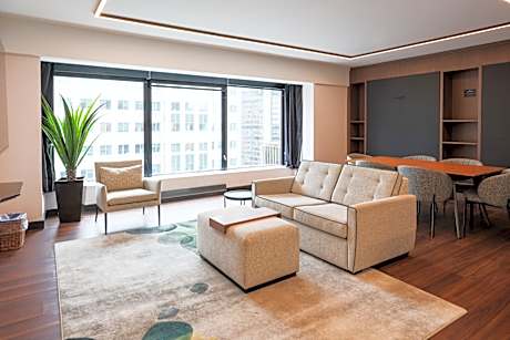 Stepping inside, guests are greeted with a blend of functional design and inviting aesthetics, ensuring a relaxed and productive stay. Each guest room is equipped with modern essentials, complemented by serene views of the hotel's lush gardens and the Montreal skyline. Beyond the rooms, the hotel extends its hospitality to a variety of on-site experiences.