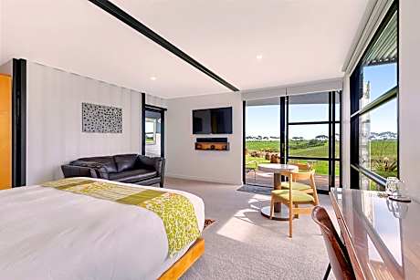 Hotel California Road at Inkwell Wines is a brand new set of three luxury private suites in the McLaren Vale wine region of South Australia. The suite floor is located on a private level of a spectacular two-story building made from 20 recycled shipping containers on a working vineyard and winery estate. Set in the vineyards on a private floor, each suite features a huge deck, soaking tub with floor-to-ceiling windows overlooking the vines, a luxurious floating king-size bed, dual vanities and rain showers, a mini bar stocked with Inkwell wine and snacks and a leather couch. Other features include Dolce Gusto coffee, a 50-inch smart HDTV with Yamaha WiFi and a bluetooth-enabled sound bar all lit with amazing light fixtures. Rooms also have ample USB charging/power points, a desk and small table with chairs. There is also an outdoor common courtyard and deck for hotel guests for watching vineyard sunsets. An Australian continental breakfast can be provided upon request. A selection of Inkwell and Dub Styles wines is available in each suite.