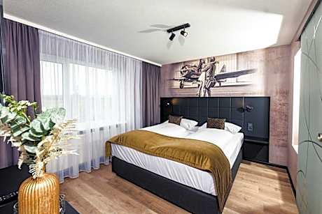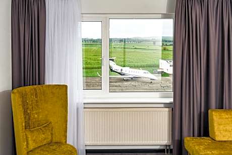 Modern and stylish room 66 ft², adjustable air-conditioning, free WiFi, 50″ Smart TV, working desk, coffee maker, private bathroom with rainshower and hairdryer. View to the landscape/airfield.