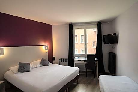 The Superior Triple rooms are air-conditioned and located on the first, second and third floor of the property. With an area of 25m2, this room can accommodate 3 people with 1 king size bed (63 in) and 1 single bed (31 in). We can also configure this room with 3 single beds of a width of 31 in. (On request 24 hours in advance and subject to availability). It has the following equipment: Desk, dressing room, courtesy tray, safe, refrigerator, flat screen TV and telephone. For better comfort, the floor is PVC and windows are double glazed. The bathrooms are equipped with a shower 90x140cm, a toilet, a hairdryer and welcome products. Last renovation: 2023 and 2024