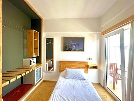 Penthouse room 41, located on the fourth floor, has one double bed - 1.35mx2m - with pillows and bed linen provided. It has an private bathroom with towels and a hairdryer. The corner location of this room means it has panoramic views from the mountains to the town square. It has a TV, desk and chair, hanging space for clothes, a mini-fridge and a safe. There is FREE-WIFI throughout the hotel. And please remember, there is not a elevator at Hotel Eden.