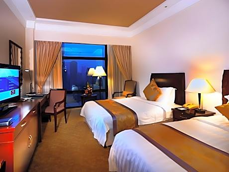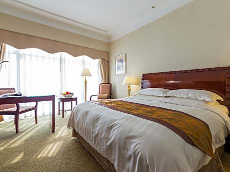 Hotel Equatorial Shanghai is conveniently located about a 4-minute drive from Shanghai Exhibition Center and Nanjing Road shopping street. It features 3 dining options and a fitness center. Jing'an Temple subway station (line 2 and 7) is a 5-minute walk away. Equatorial Shanghai Hotel is around 10-minute drive from the trendy bar area of Xintiandi and the historic Bund. It is about a 26-minute drive from Hongqiao Airport and a 50-minute drive from Pudong International Airport. Shanghai Disneyland can be reached in approximately 47 minutes by car. Offering classic wood furnishings, air-conditioned rooms at Equatorial Shanghai come with a kettle and satellite TV. They have a safe and a spacious bathroom equipped with free toiletries and a hairdryer. Guests can have fun at the on-site pool or relax at the spa center after a day of activity. The 24-hour front desk can help with luggage storage. Dining highlights include Golden Phenix, which features fine Chinese dishes and private dining cabins. Other dining options include the lobby lounge and late-night Dim Sum at the 24-hour Cafe 65.