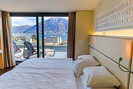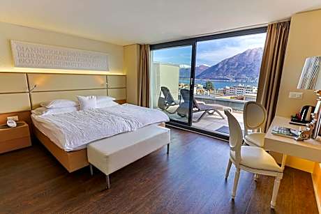 South-facing suite with a small living room and large sunny terrace with lake and mountain views.