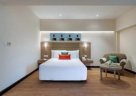 A spacious bedroom equipped with a queen-sized bed, a flat-screen TV and a safe. It comes with free mineral water and a fruit platter.