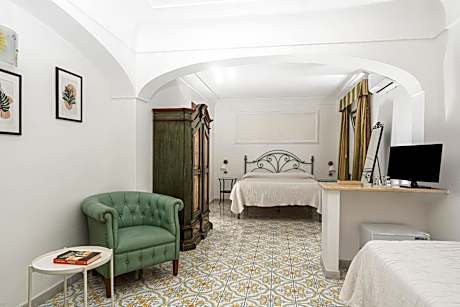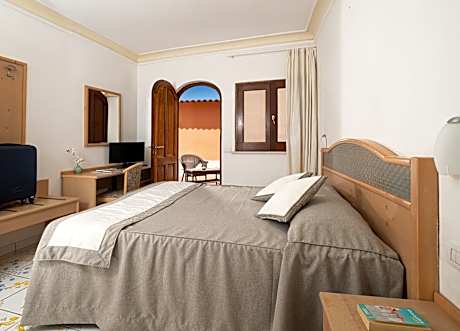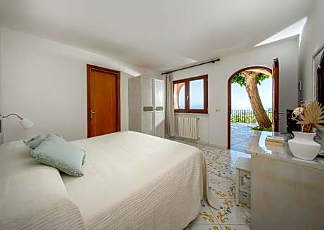 Room featuring a double bed and a single bed. Bright and airy, with direct access to the common terrace where you can admire the wonderful sea view.