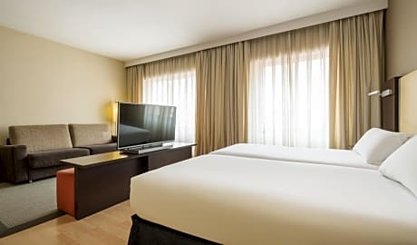 The Ilunion Suites Madrid is located in Madrid's Chamartín district. It is set next to the M-30 Motorway, which leads to Barajas airport and the IFEMA convention center. Free WiFi is available throughout the hotel. License Number: HM4275 All of the stylish rooms at the Ilunion Suites Madrid feature wooden floors and air conditioning. They have a 43-inch flat-screen TV with satellite channels. The private bathroom comes with a hairdryer and free toiletries. Most rooms are spacious suites with either an integrated or a separated living area. This hotel is officially adapted for guests with reduced mobility, accessible rooms are available on request, also for people with auditory and visual impairment. A free internet corner equipped with several computers is also available, so guests can stay connected during their stay. Ilunion Suite Madrid’s stylish restaurant serves a daily breakfast, as it also offers à la carte and set menus using seasonal products. Room service is available during limited hours and a snack bar is open all day long. A special menu is available for celiac and food intolerant guests. The Suites Madrid is 164 feet from Alfonso XIII Metro Station and a bus stop, which provide access to the city center within 20 minutes. The Castellana Convention Center and Real Madrid’s Santiago Bernabéu Stadium are both a 15-minute walk away. A range of shops and bars are available within 5 minutes' walk of the hotel. This hotel is officially adapted for guests with reduced mobility.