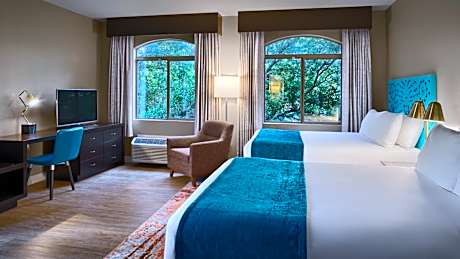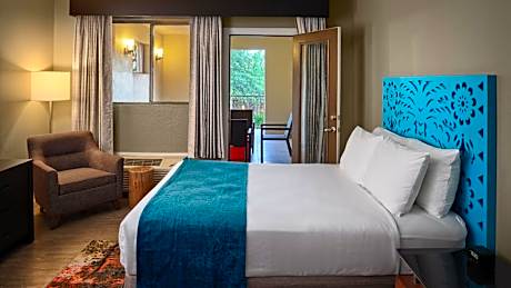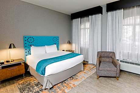 The modern rooms at Hotel Indigo San Antonio Riverwalk feature 42-inch flat-screen cable TVs, hardwood floors, free Wi-Fi, and CD players. Each room is equipped with a refrigerator and seating area, ensuring a comfortable and convenient stay. Guests can also choose rooms with scenic river views for an enhanced experience.