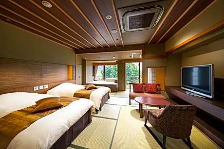 Great care is taken to ensure guests experience comfort through top-notch services and amenities. Remain linked during your visit by utilizing the complimentary internet access available. Services offered by taxi and shuttle at the ryokan ensure effortless exploration of Fujikawaguchiko. The ryokan offers complimentary parking for guests who arrive with their own mode of transport.Effortlessly plan your daily activities and travel requirements with luggage storage and safety deposit boxes provided by the front desk services. Repeatedly enjoy your best-loved attire with the aid of the dry cleaning service available at Hotel Kaneyamaen. Need some relaxation? Your room features daily housekeeping to make your stay even more comfortable and enjoyable.In limited designated zones, smoking is exclusively permitted.Crafted for coziness, every guestroom provides an array of features, guaranteeing a tranquil night's sleep while maintaining the level of comfort.For a more enjoyable stay, select rooms at ryokan are equipped with blackout curtains and air conditioning.At Hotel Kaneyamaen, guests can choose from a variety of room configurations, some of which feature separate living room and balcony or terrace.For certain chosen rooms, guests can enjoy in-room amusement like television and cable TV as a part of their stay. Rest assured that your hydration needs will be met, as some guestrooms are equipped with a refrigerator, a coffee or tea maker, bottled water, instant coffee and instant tea.It is worth noting that certain guest bathrooms feature a hair dryer, toiletries and bathrobes for your convenience.Chosen accommodation prices might include entry to the executive lounge, offering premium services amid an ambiance of refined extravagance. Begin your day on a delightful note with a scrumptious complimentary breakfast, consistently served at Hotel Kaneyamaen.Begin your holiday mornings right with your essential cup of coffee, offered daily at the cafe on-site. Enjoy an entertaining evening alongside your fellow travelers at ryokan's very own karaoke rooms and bar. Snack vending machines operate around the clock, providing you with easy access to treats regardless of the hour. Hotel Kaneyamaen provides a superb assortment of leisure amenities for guests to enjoy. Treat and spoil yourself by stopping at massage, hot tub, spa and sauna for a memorable experience.