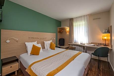 The Kyriad Hotel Lyon Bron Le Cottage *** welcomes you in a completely renovated setting where each room is air-conditioned, equipped with a flat screen TV and Wifi. Discover the menu of our restaurant L'Alpage with its homemade cuisine to delight your taste buds and relax in our lounge bar or terrace. A varied breakfast is available each morning and includes cheeses, cold cuts, breads, croissants, fresh fruit, fruit juices, yogurt, hot drinks... Guests can relax in the bar or lounge. For our events, take advantage of our equipped meeting rooms and take a break on our private terrace or petanque court. Kyriad Lyon Bron Le Cottage is 1.9 mi from Eurexpo Convention Center. It is thus ideal for both business travelers and individuals. The T2 Rebufer tram station provides easy access to the center of Lyon. Lyon St Exupéry Airport is around 8.7 mi away. The restaurant is open Monday to Thursday from 12:00 to 14:00 and from 19:00. to 21:30. Friday only from 12:00 to 14:00. The restaurant is closed on Friday evenings, weekends and public holidays.