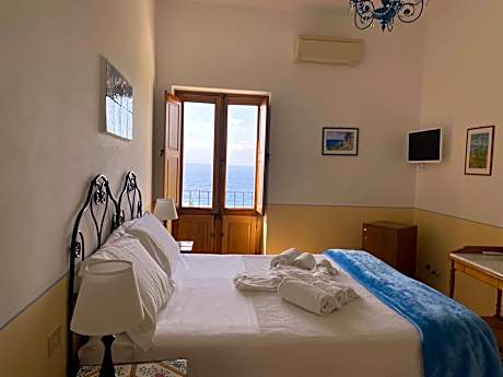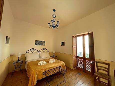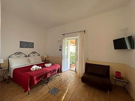 Rustic-style room featuring a sea-view patio with access to the garden. The room is equipped with a wrought-iron bed and terracotta floors. It is air conditioned and includes a TV, and private bathroom with toiletries and hairdryer.