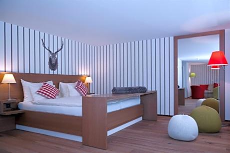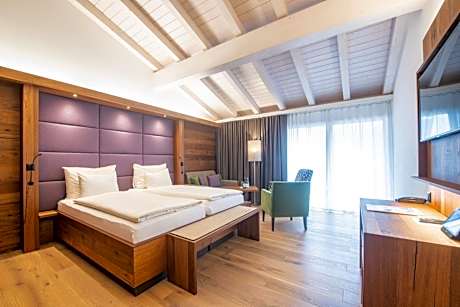 Room with stylish Alpine-style furnishings and wooden floors. Some rooms have a French balcony offering mountain views.