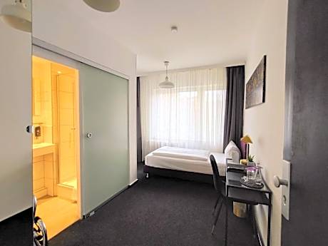 This room faces the inner courtyard and is fitted with bathroom with a bathtub. The 2 single beds can be placed next to each other.