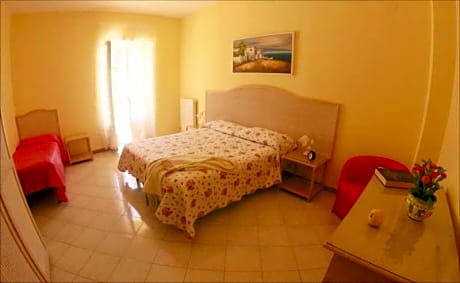 This luminous room is classically furnished. It has tiled floors and comes with private bathroom, and a fan.