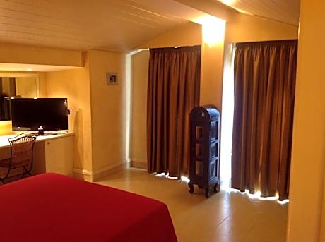 This room with attached bathroom Includes a flat-screen TV, safe and a fridge.