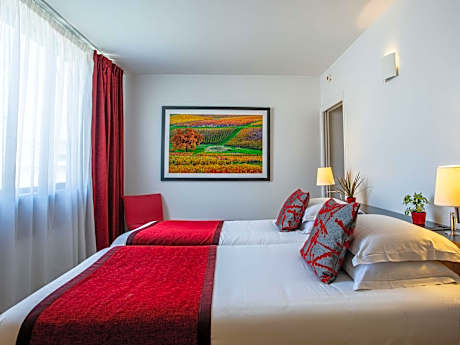 Mercure Villefranche is 656 feet from the center of Villefrance-sur-Saône and the train station. It offers a lap pool, a terrace with parasols and free Wi-Fi access is available throughout the hotel All accommodations types at Mercure Villefranche are serviced by a elevator and feature air conditioning, a flat-screen TV with cable channels and wooden floors. A private bathroom is provided and interconnecting rooms are available for families and groups of friends. A full buffet breakfast can be enjoyed every morning and guests can try bistronomic cuisine at l'Epicerie, the hotel’s restaurant. Breakfast is free for children aged 3 years old or younger and it can be enjoyed at a reduced rate by children aged between 4 and 12 years old. Cocktails are served at the bar or on the terrace. Located in the Beaujolais region, this property is a 5-minute walk from Noter-Dame des Marais Cathedral. Private parking is available on site at an extra cost.