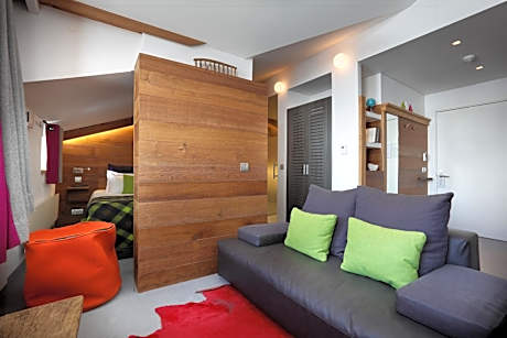 This triple room has a balcony, a flat-screen satellite TV, a docking station, a safety deposit box, a mini-bar, a telephone, and a living room with a sofa bed separated by a sliding door. The bedroom has an private bathroom with a bath and there is an additional bathroom with a shower. There is a separate toilet.