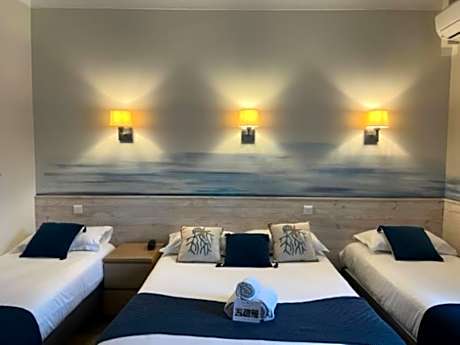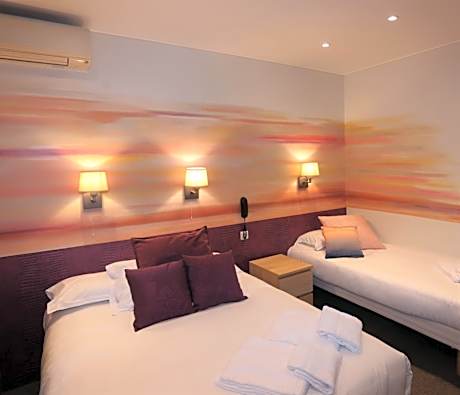These triple rooms are located on the first floor. They feature a double bed and a single bed, and are decorated with a sunset theme.
