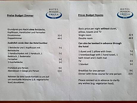 Hotel-Pension Ursula has a garden, shared lounge, a terrace and restaurant in Bad Sachsa. With free WiFi, this 3-star hotel offers ski storage space and a tour desk. Guests can have a drink at the snack bar. At the hotel, rooms include a desk. Rooms come with a private bathroom with a shower, while some rooms include a balcony and others also feature city views. The rooms have a closet. Guests at Hotel-Pension Ursula can enjoy a buffet or a continental breakfast. Guests at the accommodation will be able to enjoy activities in and around Bad Sachsa, like hiking, skiing and cycling. Harz National Park is 15 miles from Hotel-Pension Ursula, while Bad Harzburg Train Station is 29 miles from the property. Erfurt-Weimar Airport is 64 miles away.