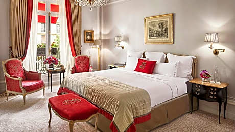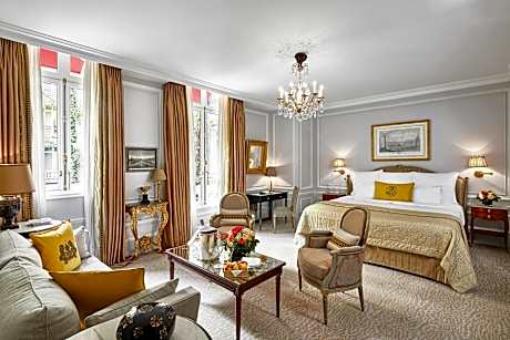 Located on the prestigious Avenue Montaigne, between the Champs-Élysées and the Seine River, Hotel Plaza Athénée is located on one of Paris’ most fashionable avenues. Nestled in the Golden Triangle of the 8th arrondissement—between avenue Montaigne, avenue des Champs-Élysées, and avenue George V—the hotel is within walking distance of high-end fashion boutiques, gourmet restaurants, and major Parisian landmarks. Since its opening in 1913, Hotel Plaza Athénée has been the preferred choice for celebrities seeking to experience the vibrant energy and timeless elegance of the City of Light. As a five-star palace hotel, it features the Dior Institut Spa and an award-winning restaurant. The hotel also offers five stylish and versatile meeting rooms, a business center, a health club, and specially designed accessible rooms and public spaces. From May to October, guests can enjoy La Terrasse Montaigne, the hotel’s elegant restaurant, set along the iconic avenue, as well as La Cour Jardin which is set in the legendary courtyard. From December to January, guests can enjoy an ice skating rink set in the hotel's private courtyard. 24-hour services include room service, concierge, laundry, and dry cleaning. Hotel Plaza Athénée has 208 rooms and 54 suites, each meticulously designed with classic Parisian elegance, showcasing Art Deco-inspired décor and stunning views. Rooms are equipped with bespoke linens, marble bathrooms, antique furnishings, and sophisticated sitting areas. Every accommodations also features heated towel racks for added comfort.