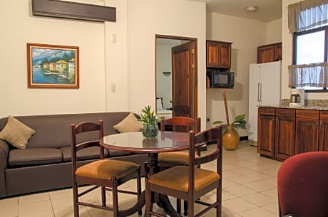 Hotel Plaza Real offers elegant Tuscan-style accommodations with fully equipped kitchens, living and dining rooms, and marble bathrooms. Silent air conditioning, Wi-Fi, and a business center are included. Its convenient location makes it an ideal choice for extended stays, whether for tourism or medical/dental treatment in Costa Rica.