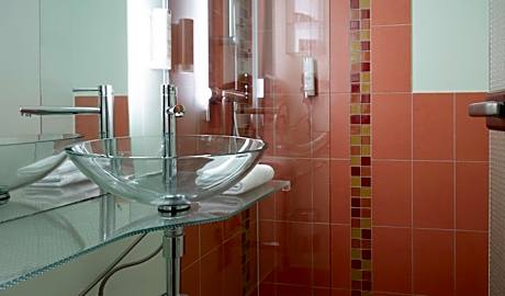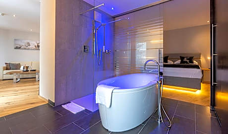 Modern room with private bathroom including a massage shower, a balcony, a mini-bar and a flat-screen TV.