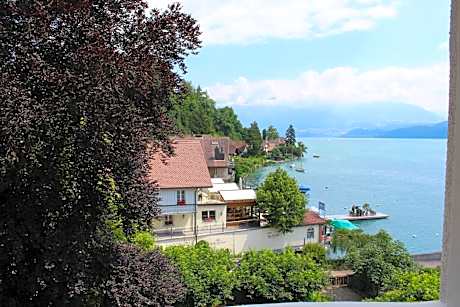 The 3-star superior Hotel Restaurant Bellevue au Lac lies directly on the shore of Lake Thun in Hilterfingen by Thun. It was built in 1918 and offers modern renovated hotel rooms with free WiFi. All rooms provide a mini-bar and a fan. We currently do not offer alcoholic beverages in our restaurant. Breafast and international food is served in the Restaurant Bellevue au Lac. A garden with a lounge, a sunbathing lawn and a bathing jetty are available on site. It is a 6min drive from Thun and a 20-minute drive from Interlaken. The public boat pier and a bus stop are 656 feet away from the hotel. All guests receive the Panorama Card on arrival, which includes free use of the local bus and many discounts.