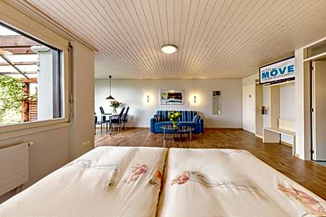 Overlooking the Bernese Alps, Hotel Restaurant Möve is set right next to the Lake Thun. The restaurant with a terrace offers panoramic views of the lake and serves local specialties. The rooms come with a balcony, a flat-screen TV and free Wi-Fi access. The hotel offers buffet breakfast and special diet menus are also available on request. You can find a playground in the garden and bicycle rental can be arranged on site. Free private parking is provided. Möve Hotel Restaurant has a helicopter landing pad and is suitable for guests with a disability. The Möve bus station and the Moonliner night bus stop are 66 feet from the property. The A8 motorway is within 656 feet. You can reach the town of Interlaken within a 20-minute drive. The Adelboden Ski Elevator is 25 mi from the hotel.