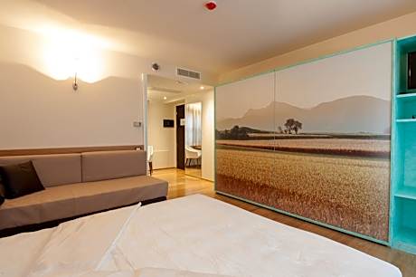 Surrounded by the vineyards, Elliot Osteria e dormire in collina is located in Manzano and it offers free WiFi throughout and modern rooms. It features a continental-style breakfast, and a large garden. The bedrooms are elegant and equipped with a flat-screen TV, an electric kettle, and air conditioning. Each comes with an private bathroom and views of the eastern hills area. Most have a private balcony. At the Elliot Hotel, a buffet breakfast is served daily and it consists of sweet and savory products. It includes ham, eggs, and bread, as well as cereal, fresh fruit, and jam. Udine is a 20-minute drive from the property, while Palmanova is 9.9 mi away.
