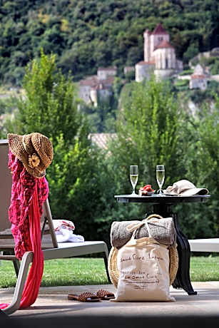 Facing Saint-Cirq-Lapopie, the Hotel Spa Le Saint Cirq *** welcomes you in the heart of the Causses du Quercy National Park. Guests can make their way to the 1148 ft² wellness area, which includes an indoor pool, steam room, sauna and sensory shower, at an extra cost. You will also enjoy a moment of relaxation by the two outdoor swimming pools open in season or on the terrace overlooking the park and the medieval village. Guestrooms at the Saint-Cirq are air-conditioned and offer free WiFi access and some have views of the medieval village of Saint-Cirq Lapopie. The rooms have private bathrooms equipped with a walk-in shower and double baths for the junior suites. Breakfast is served in the dining room by the fireplace, or on the terrace from where you can admire the site of Saint-Cirq-Lapopie. For dinner, next door to the hotel, enjoy the “Chez André” tradi-bistronomic restaurant, open every evening from Tuesday to Saturday, and for lunch on Saturdays.