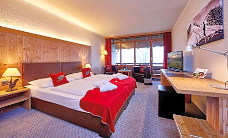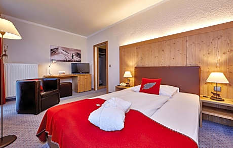 Quiet alpine style Double Room with street view and with a double bed, balcony, bath tub, WC, hair dryer, makeup mirror, mini bar, TV, telephone, WIFI, desk, safe, bathrobe and slippers.