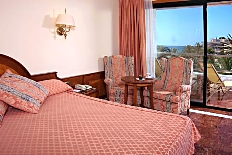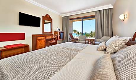 Modern, fully air conditioned and spacious rooms featuring flat screen TV, telephone, safety box, bathroom with hairdryer and bathrobes, and a balcony with sun loungers.