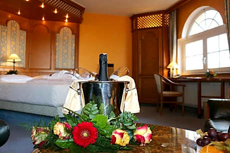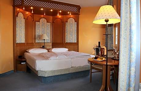 Boasting an authentic Spanish design, this hotel in Gröditz offers a Finnish sauna with quiet area and delicious Mediterranean cuisine. Dresden is approximately 1 hour away by car. Just a 7-minute walk from the Gröditz railway station, the Hotel Spanischer Hof offers individually decorated rooms, suites, and apartments with free WIFI internet access. The Spanischer Hof's honey color schemes, Spanish-style wooden balustrades, and shiny turrets create a unique Mediterranean ambiance. Relax in the hotel's sauna. You can also enjoy the sun on the terrace by the Röder stream. Spoil yourself with tasty Spanish specialties and Saxon cuisine in the Spanischer Hof's El Dorado restaurant. In the evening, pay a visit to the Peacock Bar and charming Bodega wine lounge.