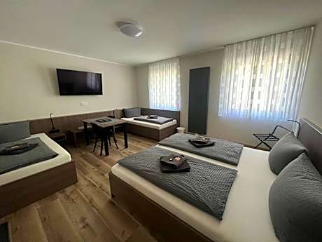 The quadruple room offers soundproof walls, a wardrobe, as well as a private bathroom boasting a shower and a hairdryer. This quadruple room has parquet floors, heating and a flat-screen TV with satellite channels. The unit has 3 beds.